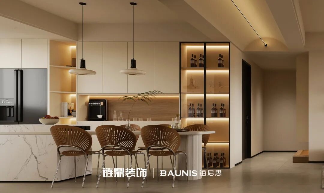 餐厅区域也超绝!大理石岛台配藤编座椅,自然质感满分,日常用餐或朋友小聚都仪式感拉满。餐边柜的玻璃格藏着酒瓶、酒杯,暖光一亮,微醺氛围感直接拿捏~💓