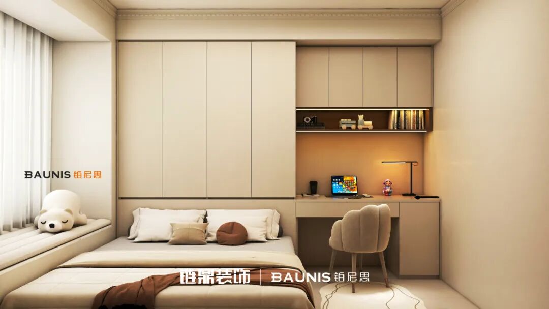 ☀️浅米色衣柜简约大气,侧边书桌区超贴心,台灯亮起时,办公学习都自带氛围感;床上堆着软糯抱枕,窗边小熊玩偶萌态十足,阳光透过窗帘轻轻洒下,往床上一躺,瞬间被治愈~🛏️