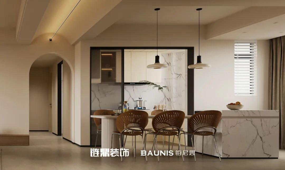 ☁️大理石岛台配藤编座椅,自然与精致碰撞,用餐仪式感稳稳拿捏。拱形门洞线条柔和,悄悄为空间添灵动。