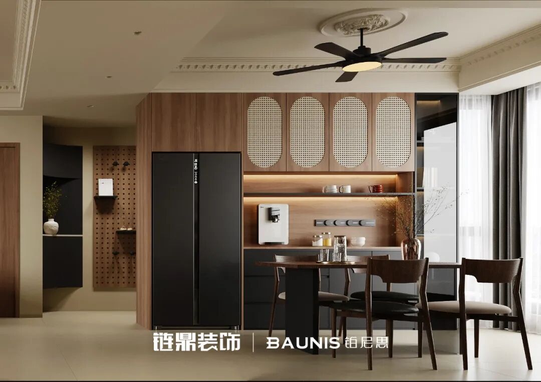 木质餐桌配几把简约餐椅,日常干饭都变香了!旁边柜体超有设计巧思,木质 + 镂空元素组合,藏着收纳又透着精致,加上嵌入的电器,实用与颜值并存~💓